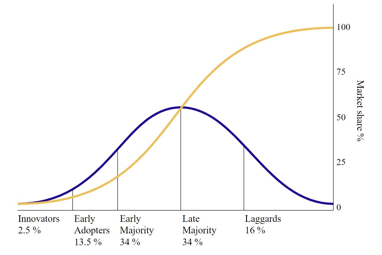 tl;dr: People have differing levels of likelihood to adopt an innovation, this can be broken into 5 key groups that largely follow a bell-curve, each with specific characteristics and catchy names.